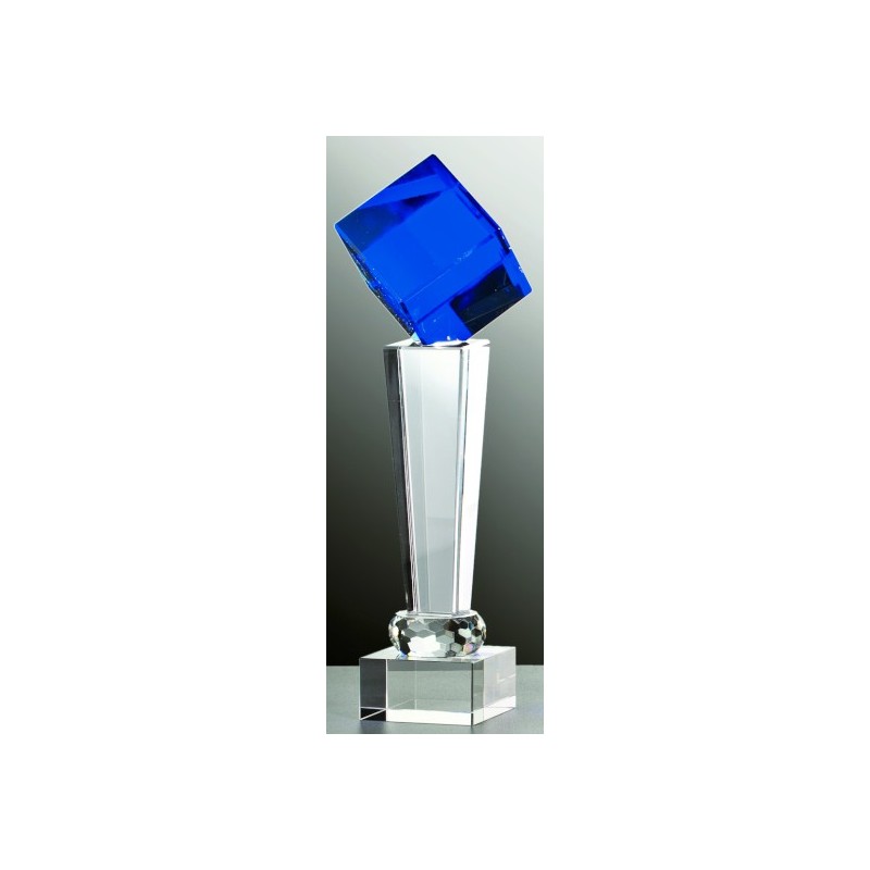 Trophée Noblesse muni d'une petite colonne entièrement en Verre avec un cube de couleur Bleu sur un socle en verre.
